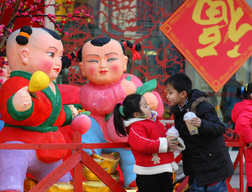 A Chinese boy talks to a girl in front of a department store decorated with the Chinese character 'Fu' and doll mascots in Nanjing, east China's Jiangsu province, January 23, 2006. 'Fu' is one of the most popular Chinese characters used in Chinese Lunar New Year, symbolising blessing, good fortune and good luck. Chinese Lunar New Year falls on January 29 this year. [newsphoto]