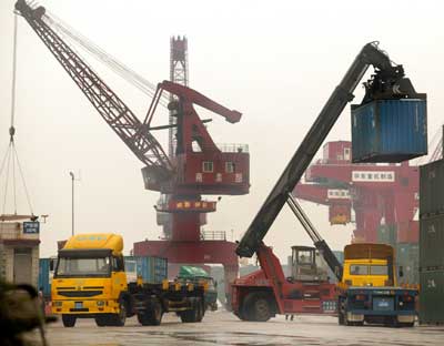 are loaded with containers at Shekou Port in Shenzhen. Shenzhen handled a