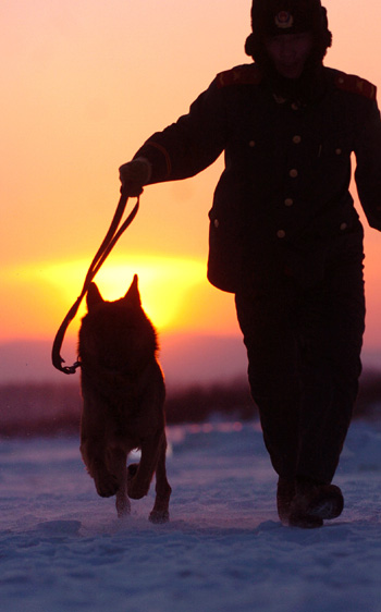 A Chinese soldier runs with his police dog on snow ground in early monring in Northeast China's Jilin Province February 2, 2006. Local frontier patrol soldiers are on guard with their dogs in the Year of Dog to better ensure the safety of the Chinese people during the Spring Festival holiday. [Xinhua]