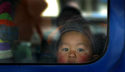 A Chinese child, among passengers on a post-festival travel rush, looks out of a train window at a railway station in Nanjing, East China's Jiangsu Province, February 4, 2006. China's passenger flow will hit two billion trips during the 2006 Spring Festival holiday, the National Development and Reform Commission predict. [Newsphoto]