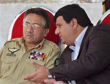 In this picture released by Pakistan Press Information Department, Pakistani State Minister for Water and Power Amir Muqam, right, explains a point to President Gen. Pervez Musharraf, left, during a ceremony in Charsadda town, near Peshawar, Pakistan on Saturday, Feb. 11, 2006.[AP]