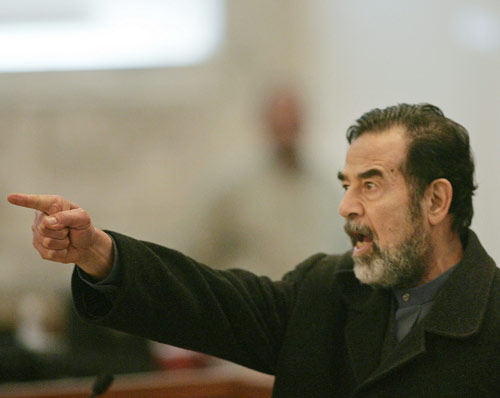 ![Former Iraqi leader Saddam Hussein gestures during his trial in Baghdad February 13, 2006. Saddam returned to court on Monday and immediately launched into tirades, pounding the railing of his metal pen, condemning the court and saying he had been forced to attend the trial, a Reuters witness said. [Reuters]](xin_440203140732734303549.jpg) Former Iraqi leader
