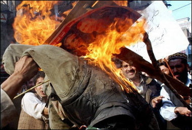 Pakistani Muslim protesters in Peshawar burn an effigy of US President George W Bush during a demonstration against the publications of the cartoons of Prophet Mohammed. Pakistan braces for new protests against cartoons of the Prophet Mohammed as officials blamed hardline groups for stoking the riots that targeted Western firms and left five people dead. [AFP]