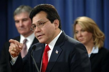 Alberto Gonzales, center, gestures during a news conference announcing the