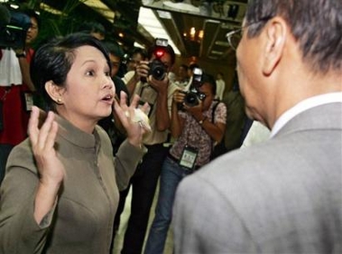 Philippine President Gloria Macapagal Arroyo, right, gestures as she talks with business group leaders inside the Malacanang presidential palace in Manila on Friday Feb. 24, 2006. Arroyo declared a state of emergency as she struggled with a reported coup plot and a possible repeat of the popular revolts that ousted two predecessors. [AP]