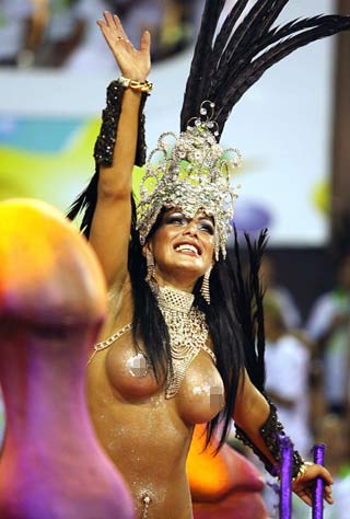 A reveller of the Salgueiro samba school performs atop a float at the start of Rio de Janeiro's Carnival parade in the Sambadrome February 26, 2006. The Carnival in the beachside city of Rio de Janeiro is famed as one of the world's best parties. [Reuters]