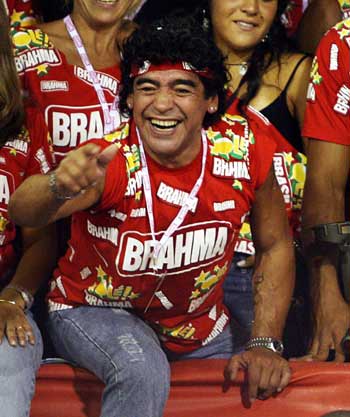 Former Argentine soccer star Diego Maradona gestures as he watches a Carnival parade from the Brahma's VIP booth at the Sambadrome in Rio de Janeiro February 26, 2006. The Carnival in the beachside city of Rio de Janeiro is famed as one of the world's best parties.  [Reuters]