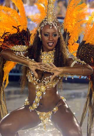 A member of the Rocinha samba school performs during Rio de Janeiro's Carnival parade in the Sambadrome February 26, 2006. The Carnival in the beachside city of Rio de Janeiro is famed as one of the world's best parties. [Reuters]