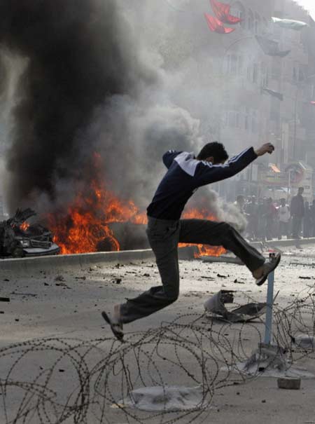 An Iraqi resident jumps over a wire obstacle