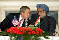 U.S. President George W. Bush, left, leans in to listen to Indian Prime Minister Manmohan Singh as they participate in a meeting with U.S. and Indian CEO's at Hyderabad House in New Delhi, India, Thursday, March 2, 2006. [AP]