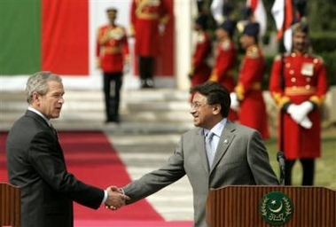 U.S. President George W. Bush, left, shakes hands with Pakistani President Pervez Musharraf at the conclusion of a joint press availability at the Aiwan-e-Sadr, of 'house of the President', in Islamabad, Pakistan Saturday, March 4, 2006. President Bush showed solidarity Saturday with Pakistani President Gen. Pervez Musharraf's war-on-terror alliance with the United States, a stance that is at odds with many in this Islamic nation. [AP]