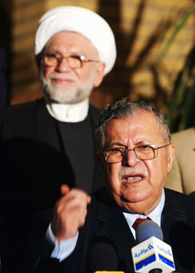 Iraqi President Jalal Talabani speaks during a news conference after a meeting with members from the United Iraqi Alliance (UIA), a coalition of Shiite political and religious parties and figures, at Talabani residence in Baghdad March 6, 2006.