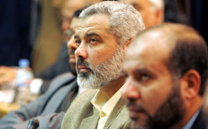 Hamas leader and Palestinian Prime Minister-designate Ismail Haniyeh (L) attends a Palestinian Legislative Council (PLC) meeting with lawmakers in Ramallah via video conference, as part of their first session as newly elected lawmakers, at the PLC building in Gaza March 6, 2006. [Reuters]