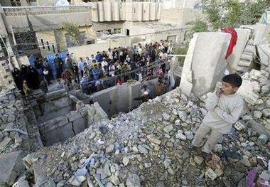 on a damaged house after a mortar attack in Baghdad, March 13, 2006.
