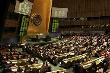 displays show voting results as the United Nations General Assembly vote