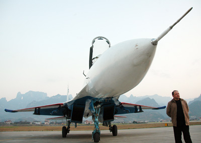 A man poses before a Su-27 fighter at an airport in Zhangjiajie, central China's Hunan Province March 16, 2006. The Russian Knights Stunt Flying Team, with five Su-27 fighters, is to stage stunt performances from March 17 to 19 in the city. If weather and other conditions are favorable, the team will fly through a mountain hole, knownly as the Heavenly Gate. The hole is only 57 meters wide at its widest point and 28 meters wide at its narrowest. [newsphoto]