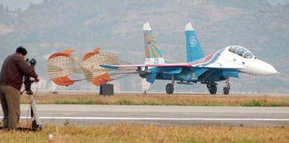 A cameraman photographs a Su-27 fighter at an airport in Zhangjiajie, central China's Hunan Province March 16, 2006. [newsphoto]