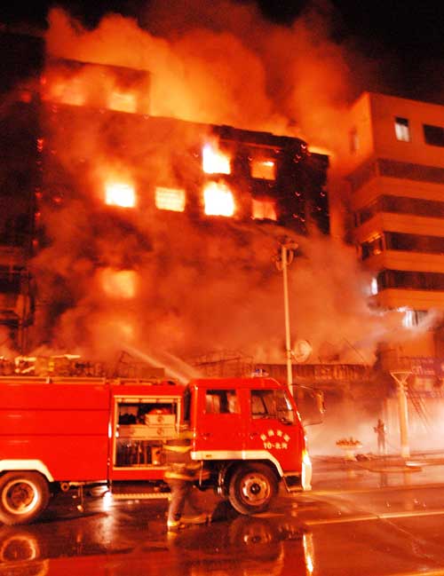 A major fire rips through a hotel in Yanji, Northeast China's Jilin Province Saturday March 18, 2006. Five people were killed and two others were injured in the accident. [Xinhua]