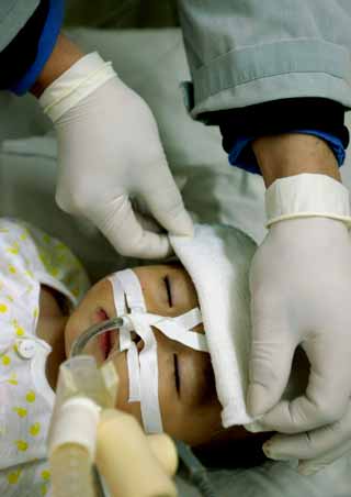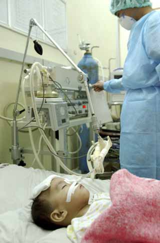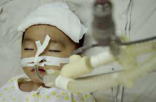 A 15-month-old baby girl breathes with assistance during her treatment for the avian influenza strain A in an Hanoi hospital January 14, 2004. Viet Nam on Wednesday reported two more suspected bird flu cases,the baby girl and a man, and up to 12 Vietnamese died from 'bird flu.' Vietnamese health officials said pigs could be possible carriers of the illness.  [Reuters]
