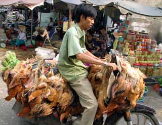 A Vietnamese man transports chickens at a market in Ho Chi Minh City January 14, 2004. [Reuters]