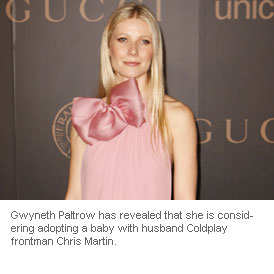 Gwyneth Paltrow has revealed that she is considering adopting a baby with husband Coldplay frontman Chris Martin.