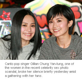 Canto pop singer Gillian Chung Yan-tung, one of the women in the recent celebrity sex photo scandal, broke her silence briefly on February 11th amid a gathering with her fans.