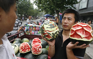 Zhang Yunxiao, a fruit dealer, carves vivid flowers like peonies and roses and other patterns on the melons. The price for each melon is 20 yuan to 50 yuan.