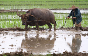 Farmers transplant rice seedlings in the field in Dahu village of Guzhai Mulam township in Liucheng county, Southwest China's Guangxi Zhuang autonomous region.