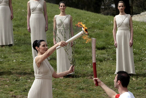 Greek actress Maria Nafpliotou (L, front), playing the role of the High Priestess, lights the torch at the dress rehearsal for the Olympic flame lighting ceremony for the Beijing 2008 Games at the site of ancient Olympia in Greece March 23, 2008. [Agencies]