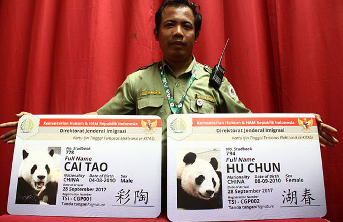 Giant panda Cai Tao was asleep for much of his debut before media Wednesday in the Indonesian city of Bogor, but occasionally perked up to eat bamboo.