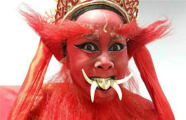 It is "teeth playing", a stunt in the old opera Ninghai Pingdiao that originated in Zhejiang province toward the end of the Qing Dynasty (1644-1911).