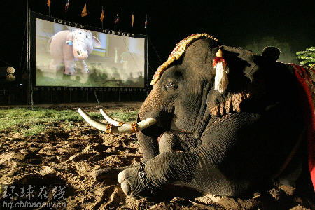 或許正是因?yàn)橛捌闹鹘鞘谴笙,觀看電影的大象們很有點(diǎn)“似曾相識(shí)”的感覺,它們不僅沒有喧鬧,相反看得相當(dāng)投入和認(rèn)真,有的老老實(shí)實(shí)趴在地上看,有的端端正正坐在地上看,還有的踏踏實(shí)實(shí)地站著看,個(gè)個(gè)都目不轉(zhuǎn)睛,一副樂在其中、悠然自得的樣子。