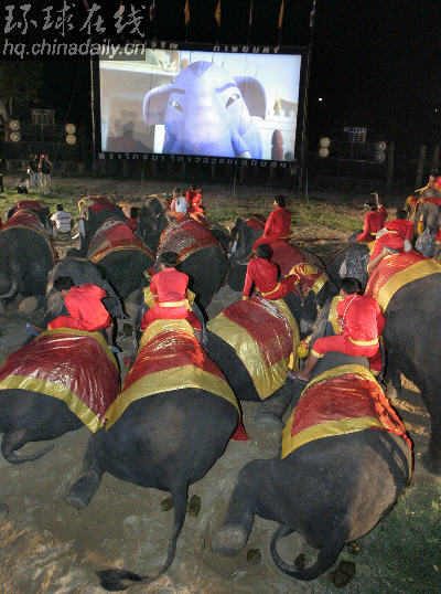 組圖:2006年6月5日,這些大象和看象人一起看電影。(路透社圖片)