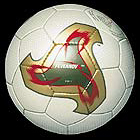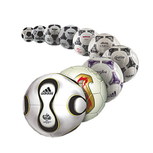 1998年法國世界杯用球——“三色旗”,由代表法國國旗的藍、白、紅三種顏色構(gòu)成,并配以象征著法蘭西民族的“雄雞”標志。球迷們更為熟悉的是上屆韓日世界杯用球——“飛火流星”,球體上的紅色火焰代表著熱情,而火焰中央的渦輪圖案則象征著韓日兩國近年來科技上的巨大發(fā)展。