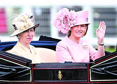 蘇菲王妃(右)粉紅色的帽子上綴有大朵的花,甚為嬌艷。安妮公主也選擇了羽毛裝飾的帽子。