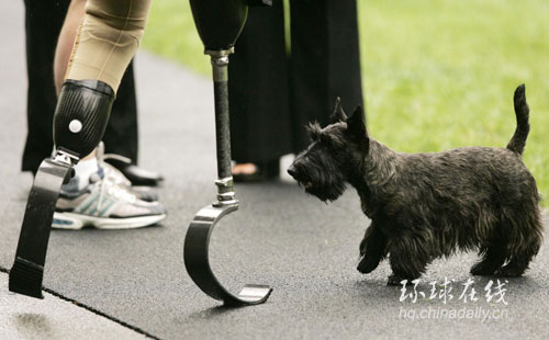 布什家的寵物狗“比茲利”對巴奇的假肢感到十分好奇。(路透社)