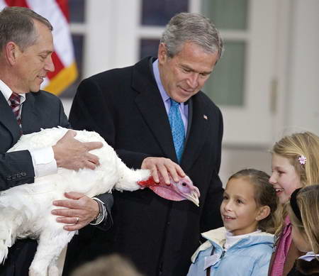 11月22日,美國(guó)總統(tǒng)布什按照白宮的傳統(tǒng)特赦了兩只名為“飛雞”(Flyer)與“炸雞”(Fryer)的火雞,它們是通過(guò)網(wǎng)絡(luò)投票海選出來(lái)的。布什輕拍著火雞的頭說(shuō):“很漂亮的火雞吧,‘飛雞’可能在想:明天怎么辦?它可能擔(dān)心自己將變成某人餐桌上的主角。我很高興地宣布,它們還有很多個(gè)明天在前面。本人行使全面總統(tǒng)特赦,讓它倆能安享天年!