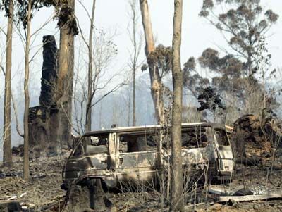 澳大利亞塔斯馬尼亞州也有3000公頃林區(qū)被毀,這是一輛被燒毀的汽車。