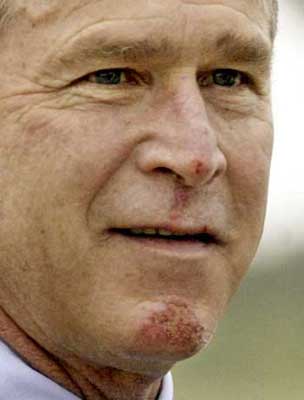 2004年5月24日,布什騎車摔倒受傷,圖為下巴、上嘴唇、鼻子擦痕。