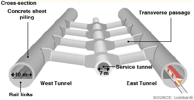歐非海底隧道的工程藍(lán)圖顯示,海底隧道將由兩個直徑10米的平形列車主隧道構(gòu)成,可以雙向通車,運載旅客、貨物等。主隧道中間還有一條直徑7米的平行的緊急隧道,三條縱向隧道之間各有四條橫向的連接隧道,可以互通。