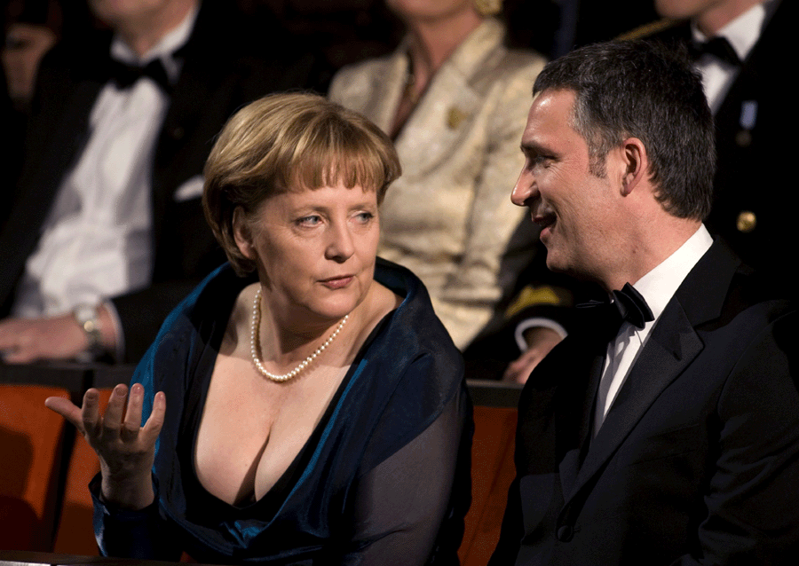 《每日郵報(bào)》13日?qǐng)?bào)道說,默克爾當(dāng)晚身穿衣領(lǐng)開得非常低的藍(lán)色晚禮服乘車來到歌劇院,挪威首相斯托爾滕貝格親自上前迎接。