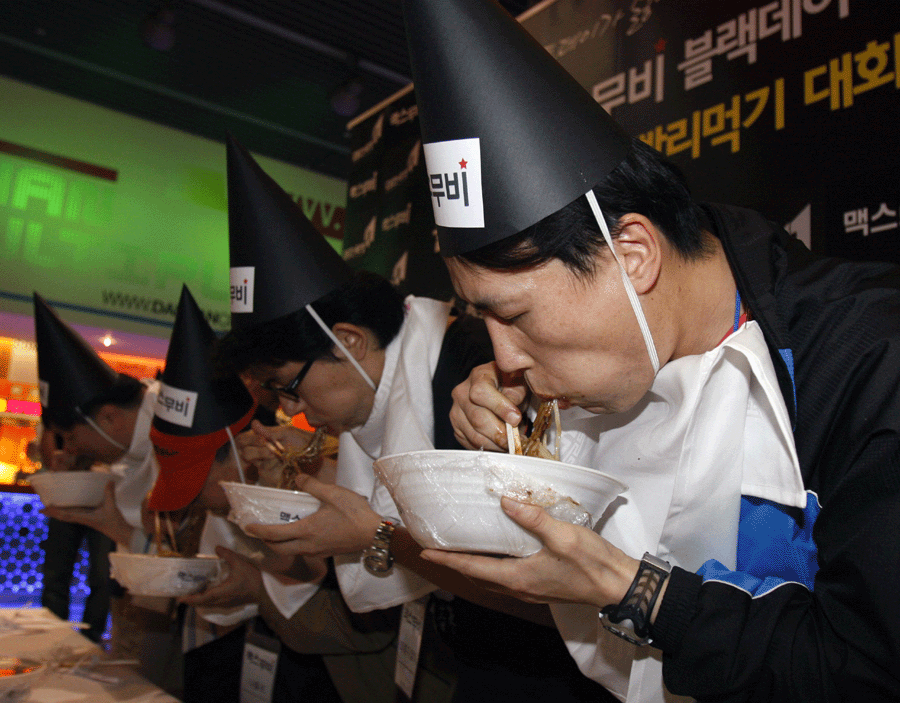 韓國(guó)一家公司在黑色情人節(jié)組織了吃黑面條比賽。