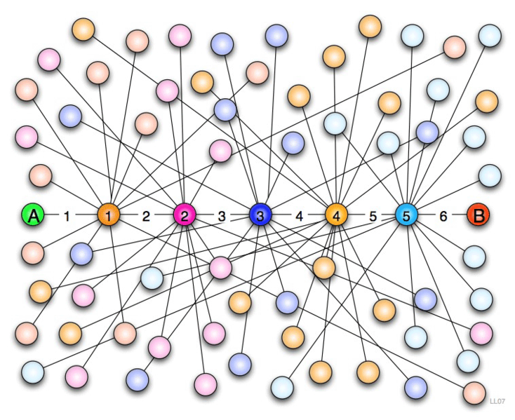 1967年,當(dāng)時(shí)是哈佛大學(xué)心理學(xué)教授的米爾格蘭姆隨便招募了300多名志愿者,請(qǐng)他們郵寄一個(gè)信函,目的地是米爾格蘭姆指定的一位住在波士頓的股票經(jīng)紀(jì)人。由于幾乎可以肯定信函不會(huì)直接寄到目的地,米爾格蘭姆就讓志愿者把信函發(fā)送給他們認(rèn)為最有可能與目標(biāo)建立聯(lián)系的親友,并要求每一個(gè)轉(zhuǎn)寄信函的人都回發(fā)一個(gè)信件給米爾格蘭姆本人。出人意料的是,有60多封信最終到達(dá)了目標(biāo)股票經(jīng)濟(jì)人手中,并且這些信函經(jīng)過(guò)的中間人的數(shù)目平均只有5個(gè),也就是說(shuō),陌生人之間建立聯(lián)系的最遠(yuǎn)距離是6個(gè)人。