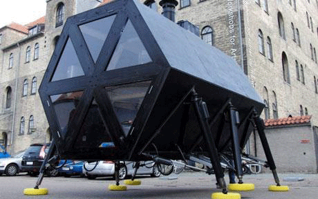 據(jù)英國《每日電訊報(bào)》10月21日?qǐng)?bào)道,設(shè)計(jì)師已經(jīng)制造出一間由6條“腿”支撐、可以跋涉于任何地形的房屋。它有10英尺(約3米)高,屋內(nèi)有起居室、廚房、衛(wèi)生間、木制火爐和一個(gè)控制這6條“腿”的大型計(jì)算機(jī)。這個(gè)屋子行走起來是靠太陽能和風(fēng)能作為動(dòng)力,每條“腿”都可以獨(dú)立行走,而且總是有三條“腿”著地以確保平衡。
