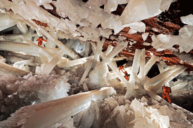 在你注意到照片中身穿橙色工作服的工人之前,你很難領(lǐng)會(huì)這片地下“水晶森林”是何等的壯觀。巨大且發(fā)光的方尖石塔多達(dá)170根,像纏繞在一起的光柱一般,散落在洞穴四周。其中最大的一根長(zhǎng)37.4英尺(約11.4米),相當(dāng)于6個(gè)成年男子的身高之和。巖壁十分潮濕,上面覆蓋著一簇簇完美無(wú)暇的晶體,就好似刀片一樣鋒利。地質(zhì)學(xué)家胡安·曼紐爾說(shuō):“礦石竟以如此美麗的姿態(tài)展示自己,這在地球上是獨(dú)一無(wú)二的。”