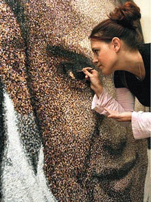 這幅巨作的尺寸為8英尺(約2.4米)×5英尺(1.5米),一共由25萬張小紙片粘合而成。它的作者、現(xiàn)年34歲的杜斯韋特女士整整花了12周的時(shí)間才將每一張紙片粘到了巨大的肖像上面,并恰好在漢密爾頓奪得巴西國際汽車大獎賽冠軍的前幾天大功告成。從一定的距離以外看,這幅作品似乎與傳統(tǒng)油畫沒什么兩樣,只有當(dāng)你走近時(shí),才會發(fā)現(xiàn)它是由打孔機(jī)出來的圓紙片做成的。