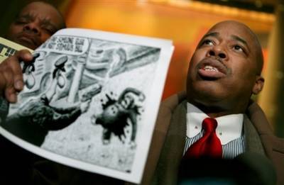 紐約州參議員亞當(dāng)斯手持引發(fā)爭(zhēng)議的漫畫站在紐約郵報(bào)大樓前抗議