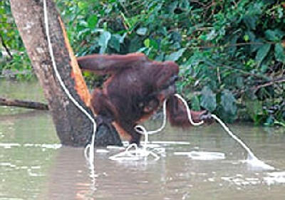 照片拍攝于馬來西亞的婆羅洲島。因?yàn)楹樗?,這只母猩猩和它的幼子原本都被困在樹上,但是不知何故小猩猩突然落入水中,這讓母猩猩非常著急,當(dāng)?shù)卮迕褚矝]有想出好的辦法來解救它們母子倆。幸虧世界自然基金會(huì)的工作人員及時(shí)趕到,急中生智給母猩猩遞過去一條繩子。