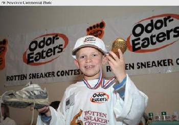 中國(guó)日?qǐng)?bào)網(wǎng)環(huán)球在線消息:綜合英美媒體3月25日?qǐng)?bào)道,24日,第34屆“全國(guó)食味者臭鞋大賽”(National Odor-Eaters Rotten Sneaker Contest)在有著“全球臭鞋之都”稱號(hào)的美國(guó)佛蒙特州首府蒙彼利埃市舉行。參賽的7名選手年齡均在7至15歲之間,都是經(jīng)過層層選拔的州冠軍,最終來自猶他州的7歲男孩喬舒亞·布思“臭冠群腳”,如愿奪得“臭鞋大王”。憑著腳上一雙極具殺傷力的破爛運(yùn)動(dòng)鞋,布思不但贏得2500美元的獎(jiǎng)金和一次免費(fèi)的“紐約豪華游”,還可享受由除臭用品制造商免費(fèi)提供的一年除臭產(chǎn)品貴賓級(jí)待遇。