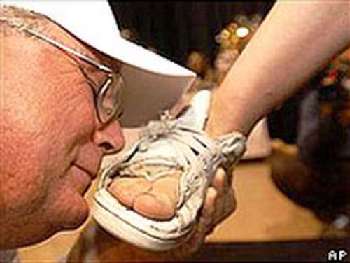 按照比賽規(guī)則,參賽者需先穿著各自精挑細(xì)選后的破鞋進(jìn)行一系列令人汗流浹背的運(yùn)動(dòng),再伸出臭腳,讓評(píng)委評(píng)定臭味等級(jí)。除了要夠臭以外,鞋底、鞋舌、鞋頭和鞋帶是否夠破也是重要的評(píng)判標(biāo)準(zhǔn)。此次大賽的評(píng)委小組由在氣味界極具權(quán)威的美國(guó)航空航天局(NASA)和布朗大學(xué)的氣味研究專家組成。只見評(píng)委們極其敬業(yè)地湊近那一雙雙臭鞋,仔細(xì)端詳,再將鼻子探到其下,小心聞嗅,謹(jǐn)慎評(píng)判。